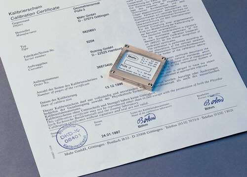 Oberflächennormal mit sinusförmigem Rillenprofil zur dynamischen Überprüfung des Rauheitsmessplatzes. Ra, Rz, Rmax. Planglasfläche.