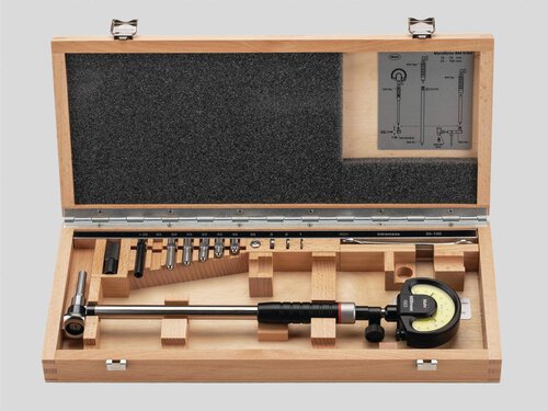 Package contains: measuring holder, measuring head, anvil spindle, wooden case, excludes indicator